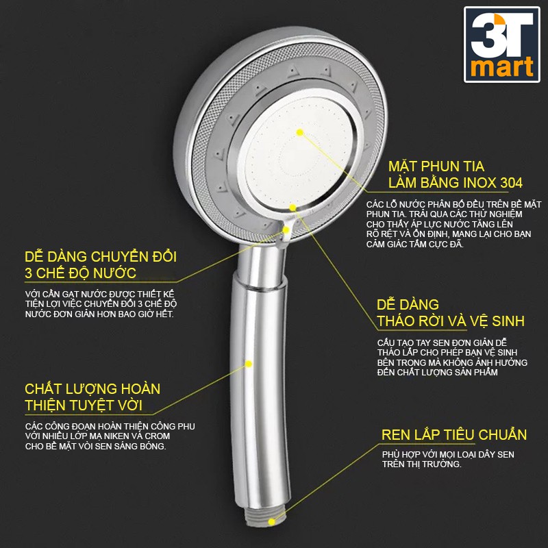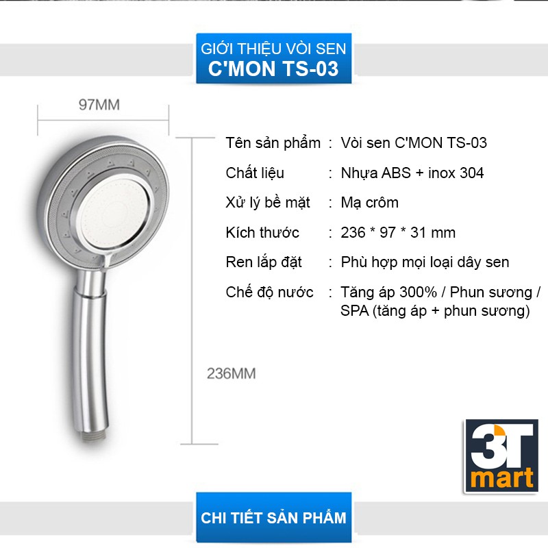 Giới thiệu Bộ vòi sen tăng áp 3 chế độ nước tắm nóng lạnh được C'MON TS-03 + dây sen (bạc)