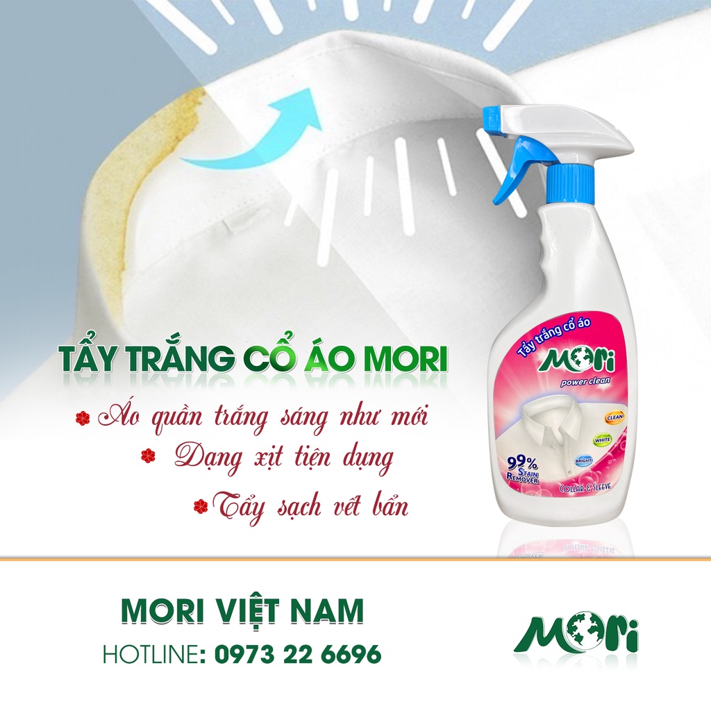 🌼TẤY TRẮNG CỔ ÁO MORI Áp dụng được với quần áo trắng và quần áo màu. Với công thức độc đáo, sản phẩm tẩy trắng cổ áo Mori dạng xịt giúp loại bỏ các vết bám bẩn, mồ hôi, dầu của da trên cổ áo và tay áo một cách hiệu quả nhất, mang đến vẻ sạch sẽ, thơm mát và trắng sáng trở lại cho những chiếc áo của bạnDung tích: 620ml