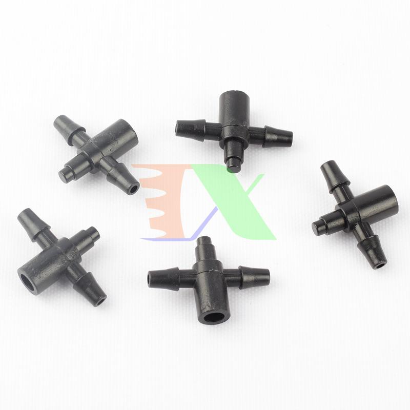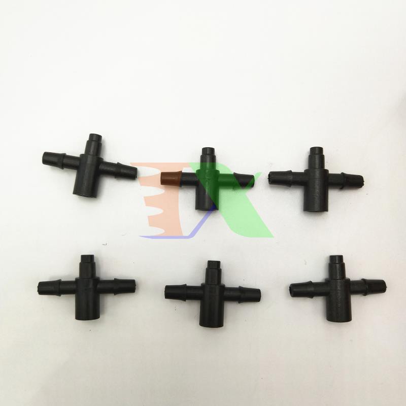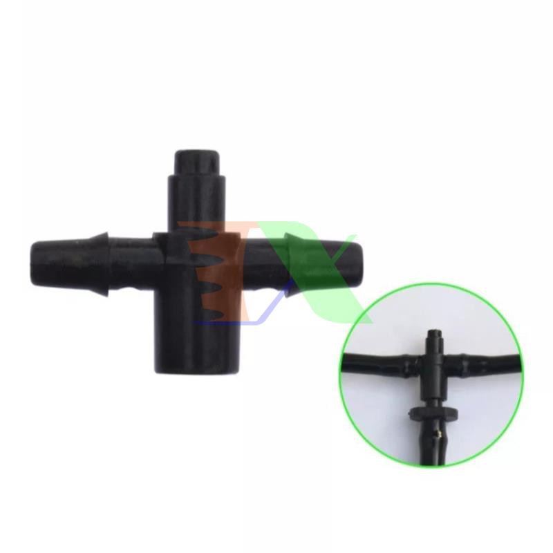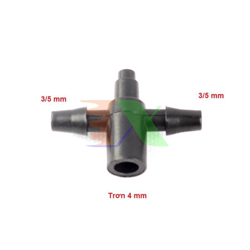 T chia 3, 1 đầu trơn 4mm, 2 đầu gân 3/5 (ống PE Φ3/5) để chia ra nhiều đầu tưới từ khởi thủy 1 đâu trơn 4mm sang dây dẫn PE 3/5. là sản phẩm không thể thiếu, là khớp nối cho hệ thống tưới, sản phẩm có độ đàn hồi cao, bền bỉ với môi trường. Chia 2 cho ống PE Φ3/5 là đầu nối lấy nước từ dây dẫn ống dây dẫn tưới Φ16 và nối vào dây tưới Φ3/5 đầu tưới nhỏ giọt, hoặc que cắm nhỏ giọt.