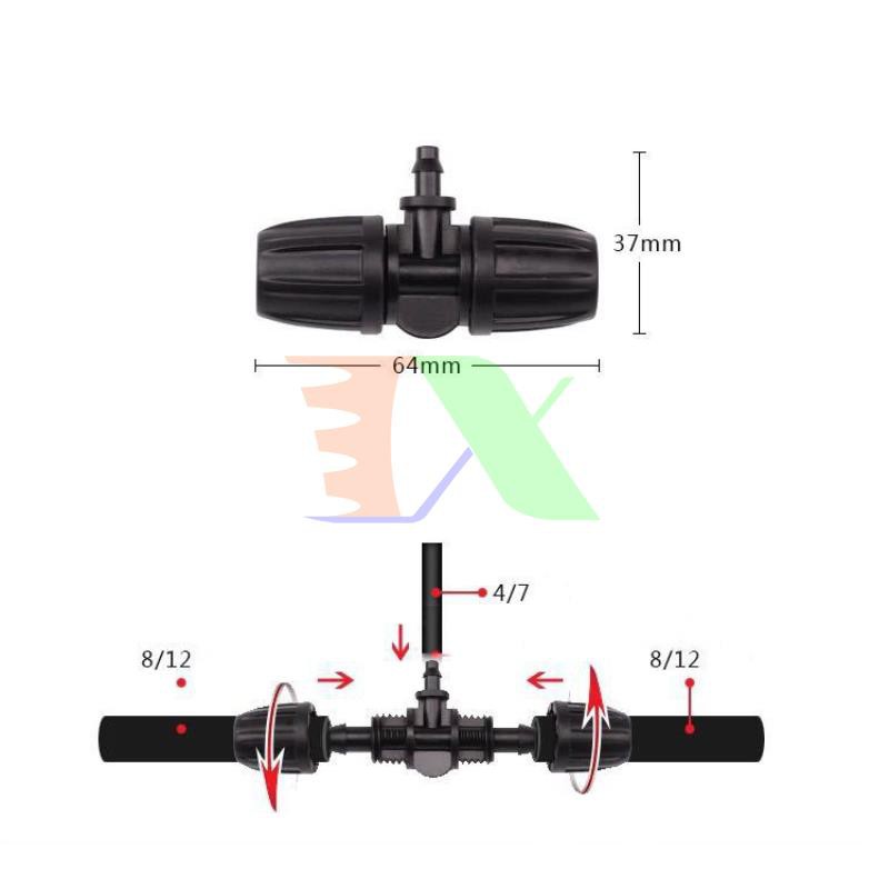 Tê chia cho ống Φ811 912 mm ra 4/7 để chia ra nhiều đầu tưới từ dây dẫn nước to sang dây dẫn nhỏ hơn cho hệ thống tưới là sản phẩm không thể thiếu, là khớp nối cho hệ thống tưới, sản phẩm có độ đàn hồi cao, bền bỉ với môi trường. Tê chia cho ống Φ811 912 mm ra 4/7 là đầu nối lấy nước từ dây dẫn ống dây dẫn tưới Φ812 và nối vào dây tưới Φ4/7 đầu tưới nhỏ giọt, hoặc que cắm nhỏ giọt.