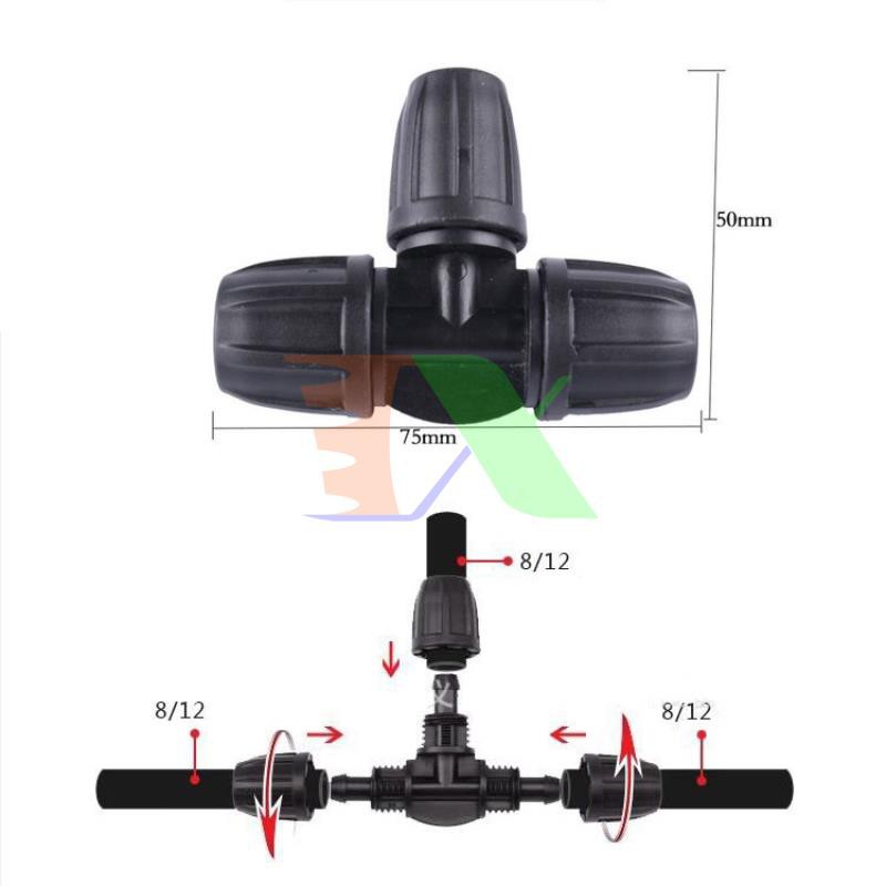 T chia 3 cho ống PVC Φ812 để chia ra nhiều đầu tưới từ dây dẫn nước to sang dây dẫn nhỏ hơn cho hệ thống tưới là sản phẩm không thể thiếu, là khớp nối cho hệ thống tưới, sản phẩm có độ đàn hồi cao, bền bỉ với môi trường. Chia 2 cho ống PE Φ812 là đầu nối lấy nước từ dây dẫn ống dây dẫn tưới Φ812 và nối vào dây tưới Φ812 đầu tưới nhỏ giọt, hoặc que cắm nhỏ giọt.