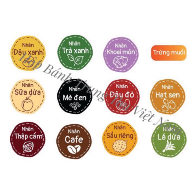1 tờ 25 tem nhãnCác vị bánh trung thu truyền thống đến hiện đại gồm: Đậu xanh ,trà xanh ,khoai môn ,trứng muối ,sữa dừa, mè đen ,đậu đỏ ,hạt sen , thập cẩm,cà phê,sầu riêng, lá dứa