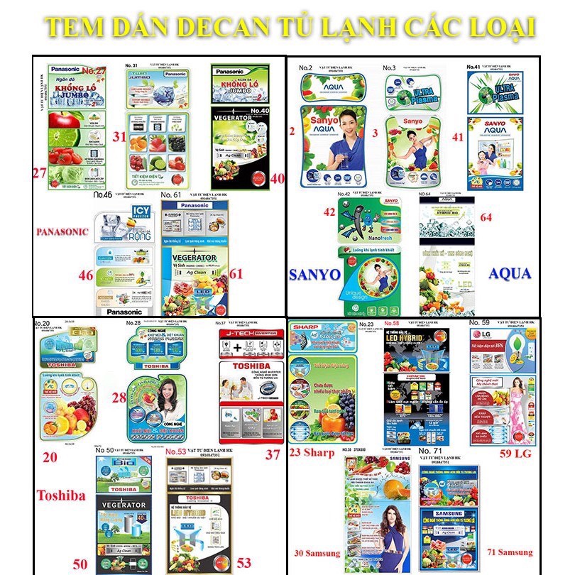 Thiết Bị Điện Gia Dụng > Đồ gia dụng nhà bếp > Tủ lạnh || TEM DECAN DÁN TỦ LẠNH - Các hãng Panasonic Sanyo Aqua Toshiba Samsung Sharp Hitachi LG ( Sử dụng băng dính 2 mặt)Còn hàng