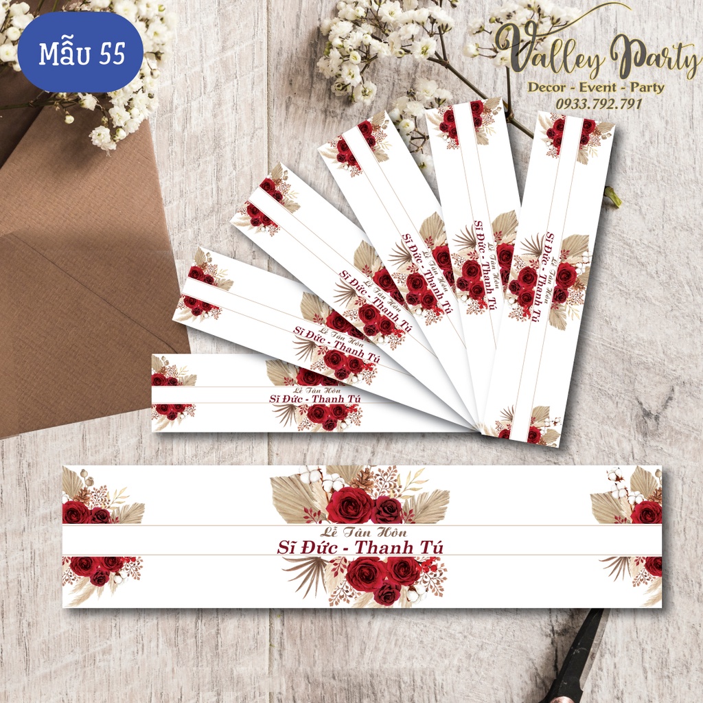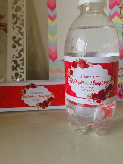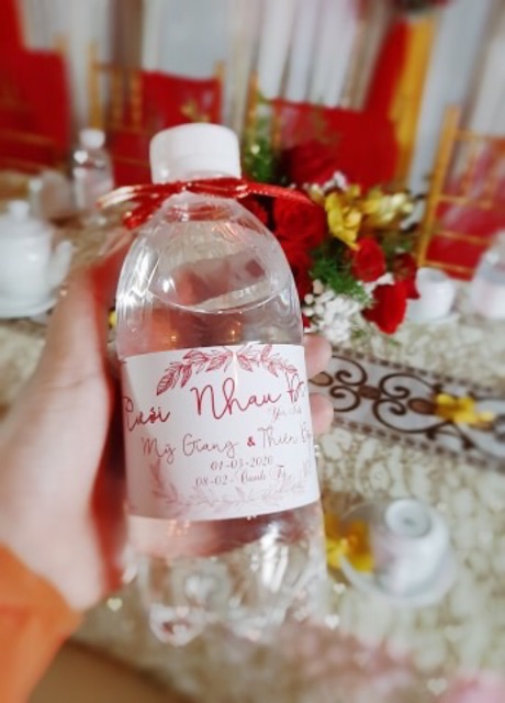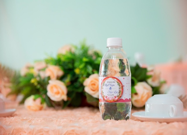 Tem quấn chai nước đám cưới thiết kế theo yêu cầuDùng trang trí bàn hai họ trong đám hỏi, đám cưới