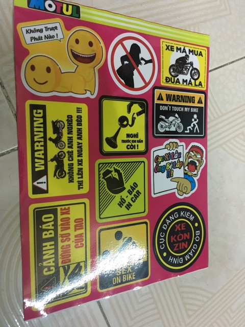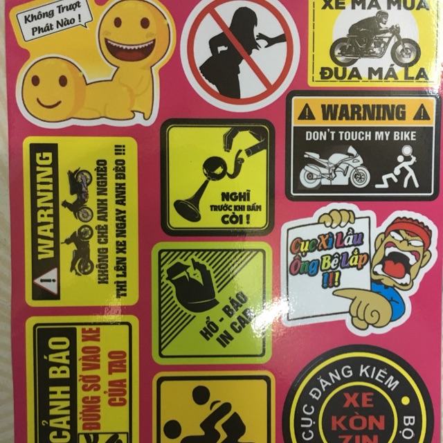 Tem logo sét cảnh báo cục xì lầu ông bê lắp và các tem cảnh báo xe má mua đua má la, .... như hình gồm các logo trong hình .Tem 3 lớp không phai màu, không thấm nước.