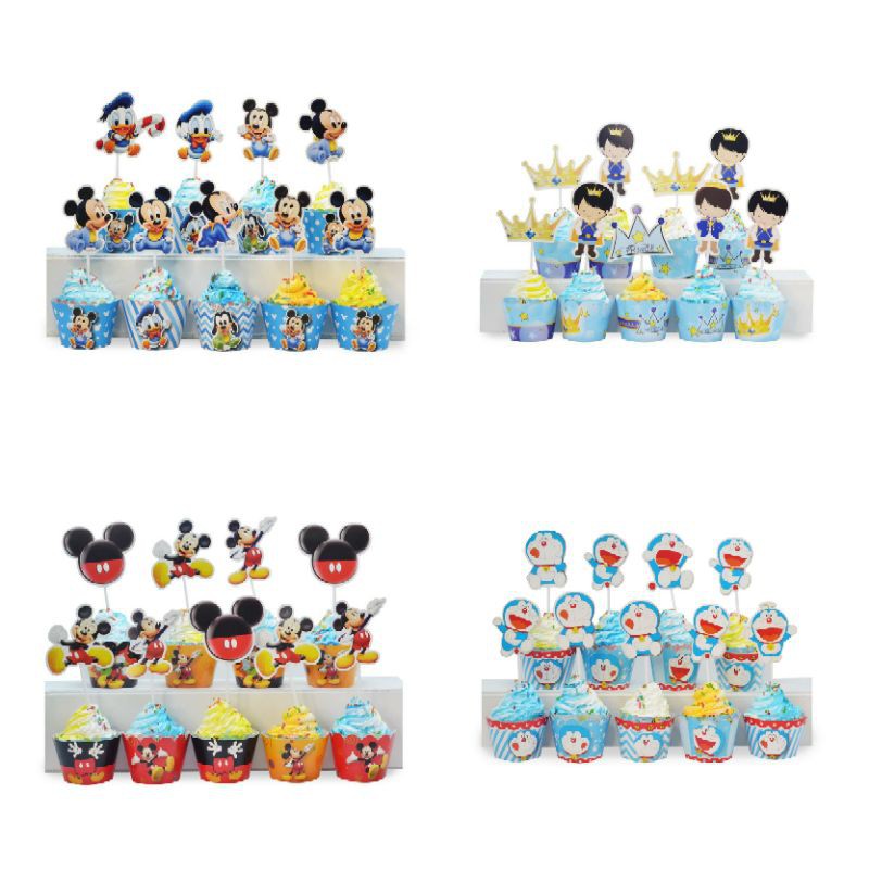 Tem cắm bánh cupcake theo chủ đề và miếng quấn bánh cupcake.đóng gói 10 tem và 10 miếng quân trong 1 gói.