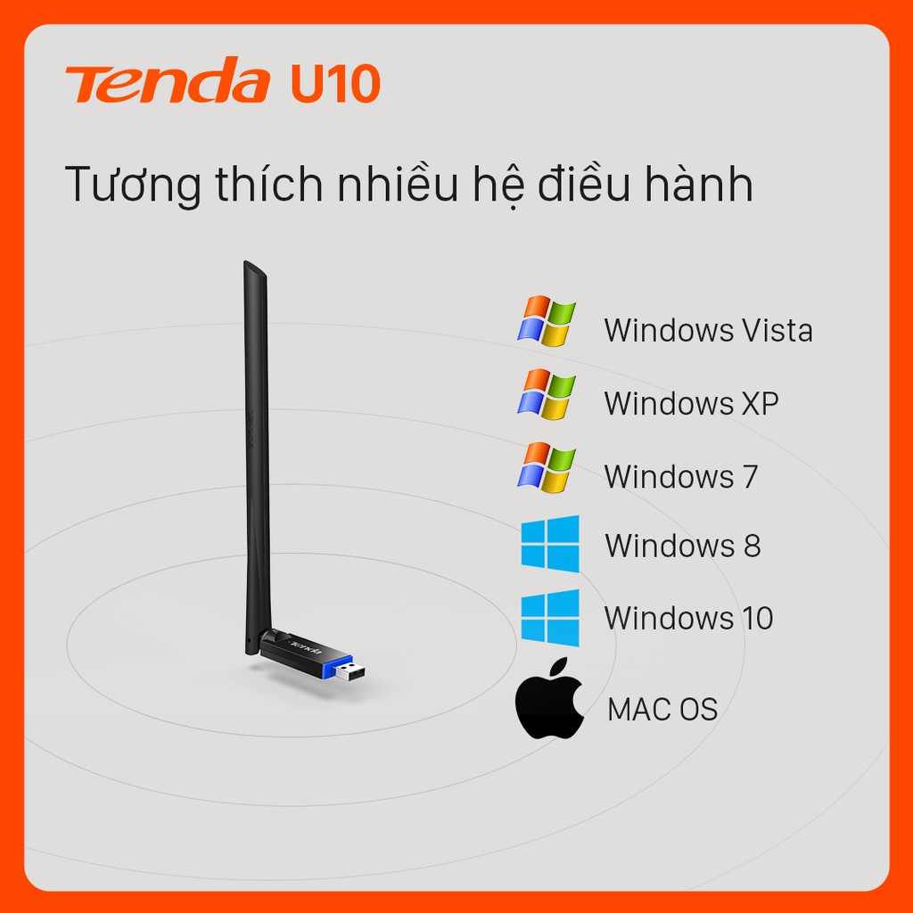 Tenda U10 tương thích các hệ điều hành Windows XP/7/8/8.1/10 ... , đáp ứng nhu cầu kết nối WiFi của máy tính bàn, laptop và các thiết bị khác