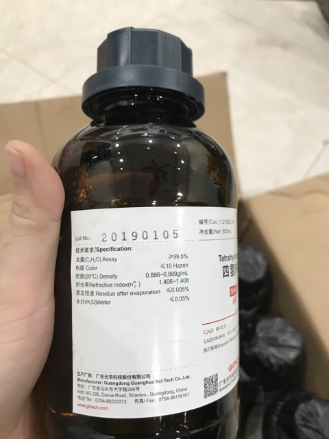 Nhà cửa & Đời sống > Làm vườn > Trang trí vườn || Tetrahydrofuran 99.5% C4H8O chai 500ml Xylong Trung Quốc thf CAS 109-99-9Còn hàng