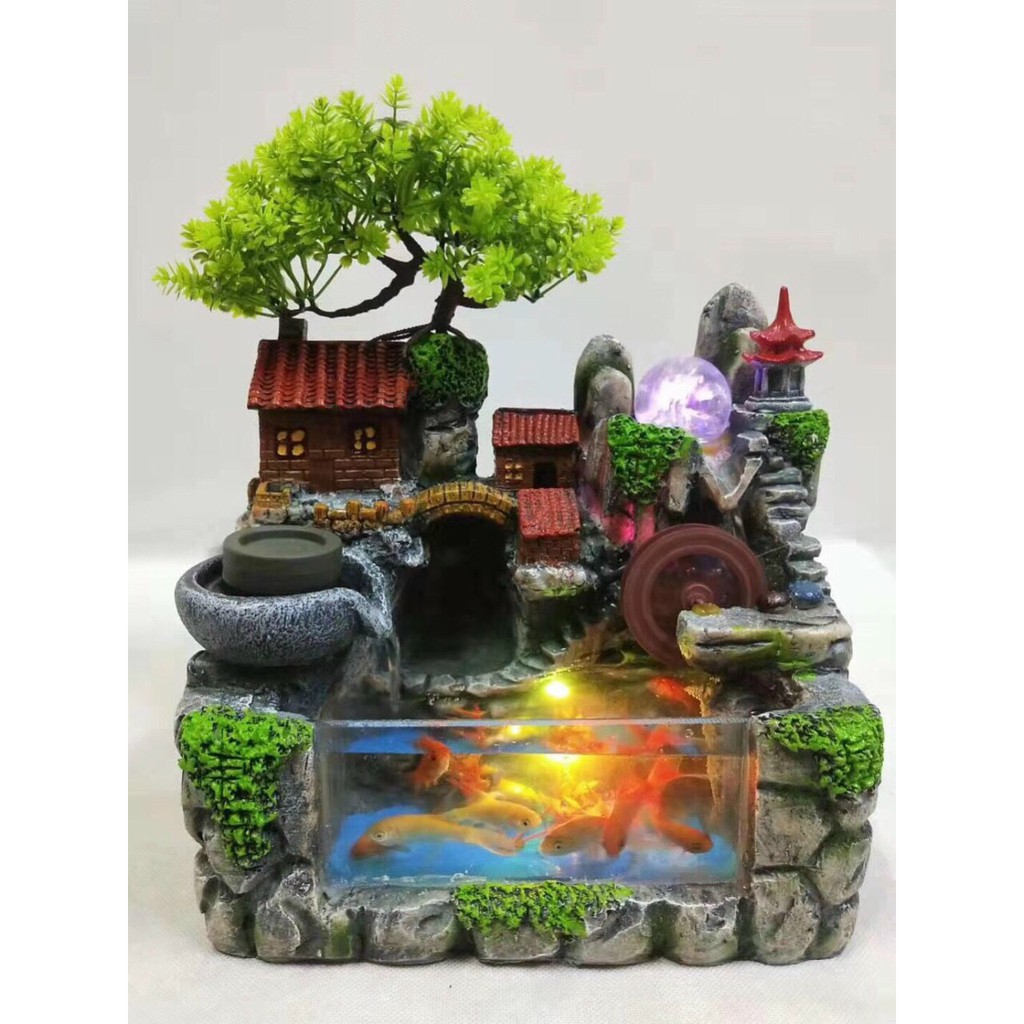 2) thác + máy khói: thác, máy bơm, đèn led, bi, cây giả, máy khói