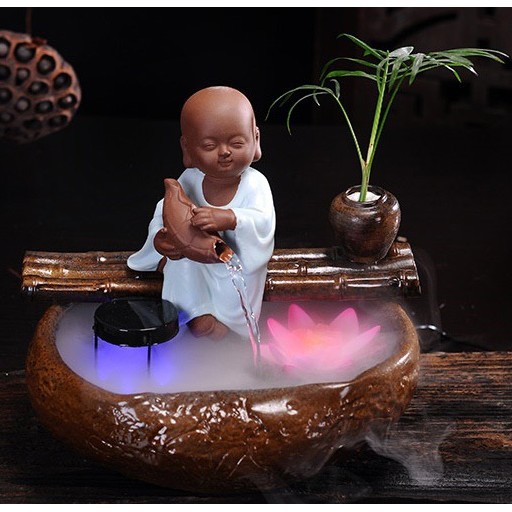 Thác Nước Chú Tiểu Ôm senChú tiểu ngồi bên suối tao nhã và điềm tĩnh, dòng suối chảy êm đềm , Thác được thiết kế chậu trồng hoa để tăng mảng xanh cho không gian. Chất liệu gốm cao cấp, đường nét chú tiểu tinh xảo, chậu gốm khắc hoa văn sen . làn nước mát trong lành hòa điệu cùng không gian thêm nhẹ nhàng và tươi mát.