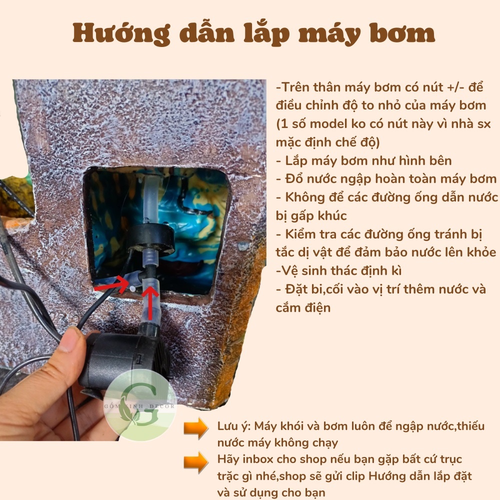 - Đổ nước vào thác sao cho nước ngập hoàn toàn máy bơm,để máy khói ngập nước khoảng 1 cm tránh vật cản trước mặt máy khói để khói ra đều