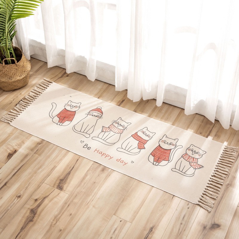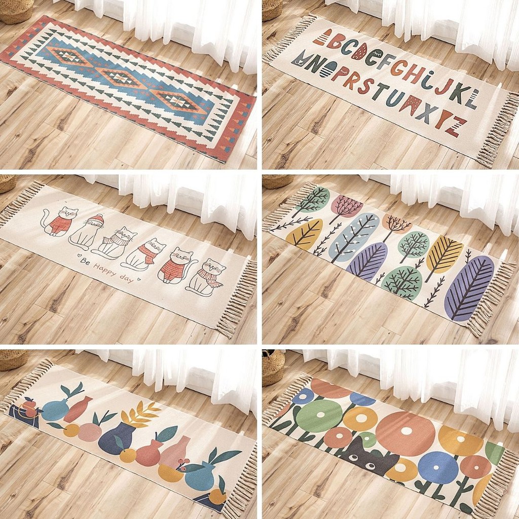 Sở hữu nhiều họa tiết cùng những màu sắc nổi bật: bảng chữ cái, cây cỏ hay những chú mèo đeo khăn choàng, Thảm Canvas Trải Sàn Tua Rua Phong Cách Bắc Âu Trải Chân Giường Phòng Khách còn được thêm vào chi tiết tua rua đặc trưng của phong cách Bohemian, giúp người dùng dễ dàng trang trí cho những không gian khác nhau.