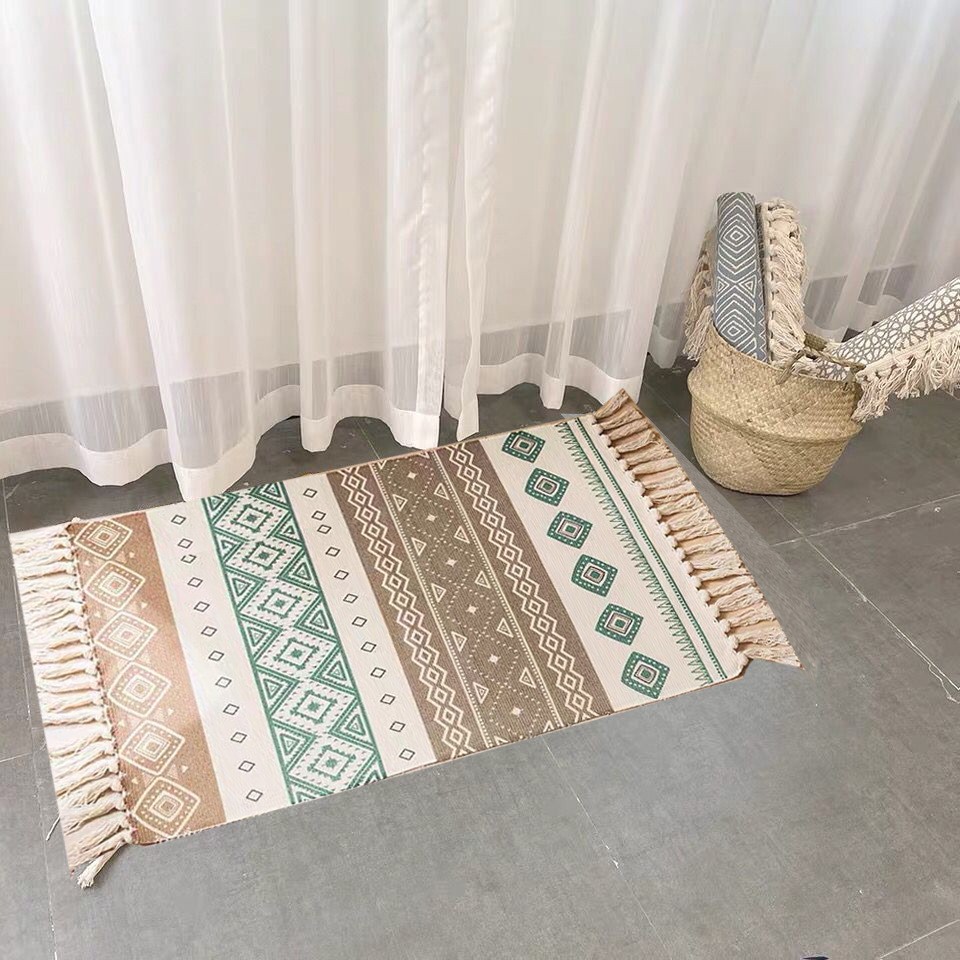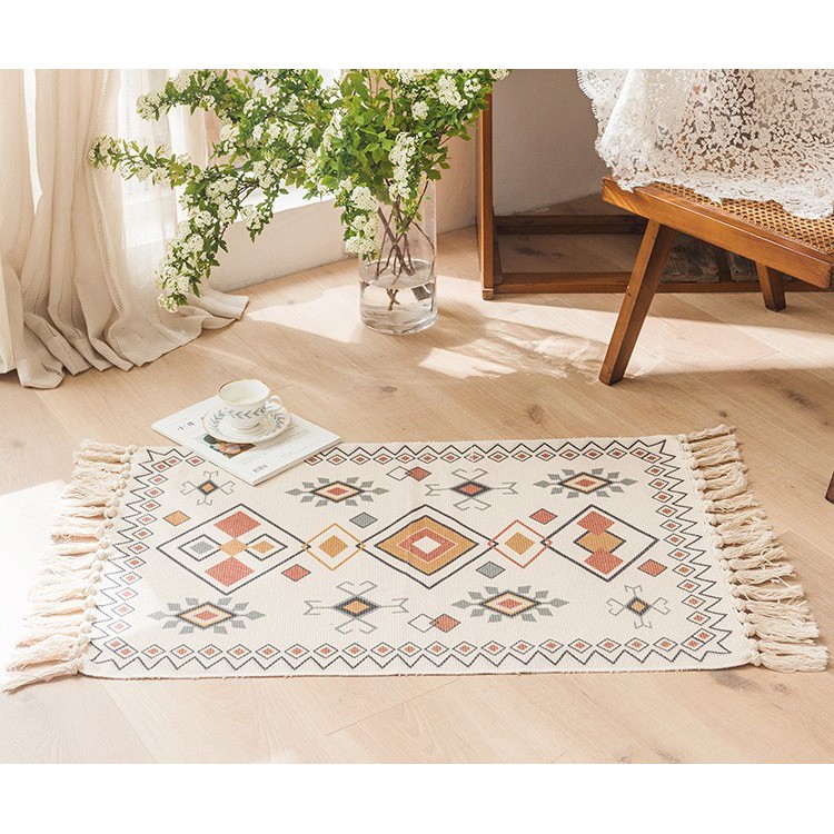 Thảm Canvas Tua Rua Bắc Âu Thổ Cẩm Hình Học Cam Nâu 60x90cm trang trí được in màu trên lớp vải canvas sang trọng, hai bên phối tua rua tạo nên không gian sống vô cùng vintage và cá tính.Thảm Canvas Tua Rua Bắc Âu Thổ Cẩm Hình Học Cam Nâu 60x90cm tiện dụng để ở cửa ra vào, dưới chân giường ngủ, ghế sofa hay cả trải lót ở khu vực nhà tắm. Với nhiều hình họa tiết đáng yêu là vật dụng trang trí vô cùng ấn tượng.
