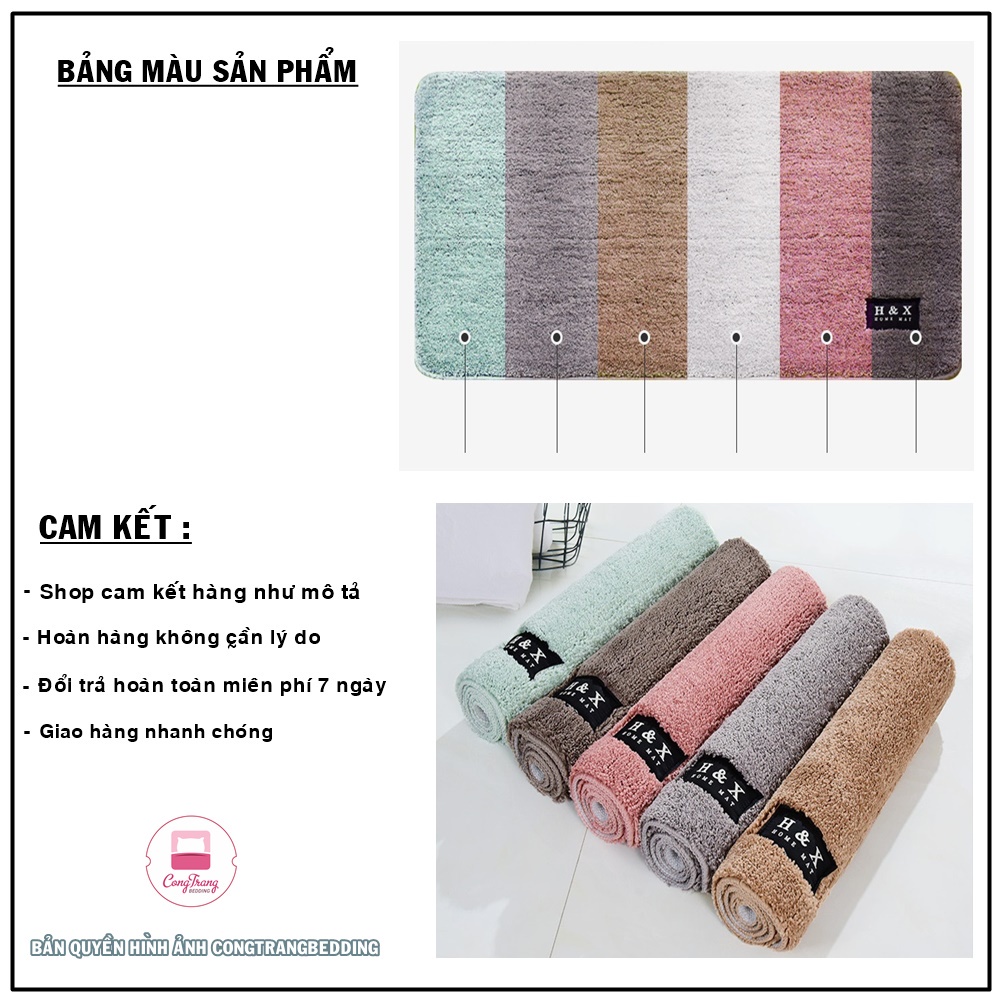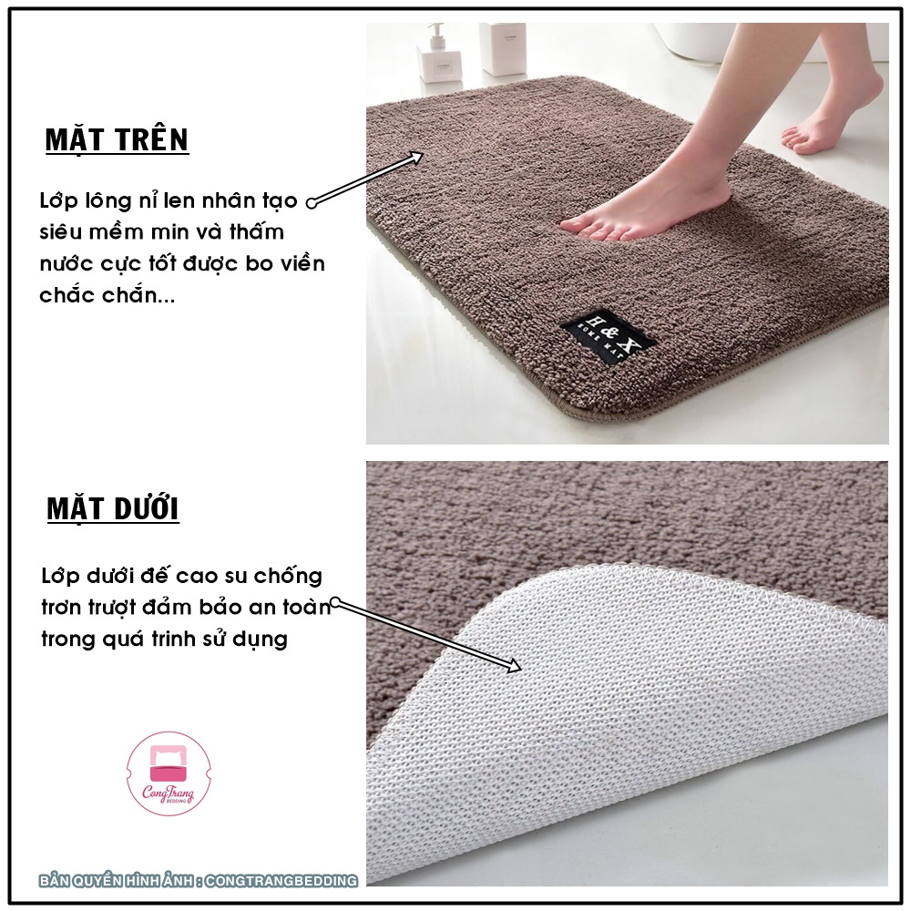 - Chất liệu: bề mặt thảm bằng sợi lông len , mặt đáy bằng chất liệu cao su sần tăng ma sát chống trơn trượt.