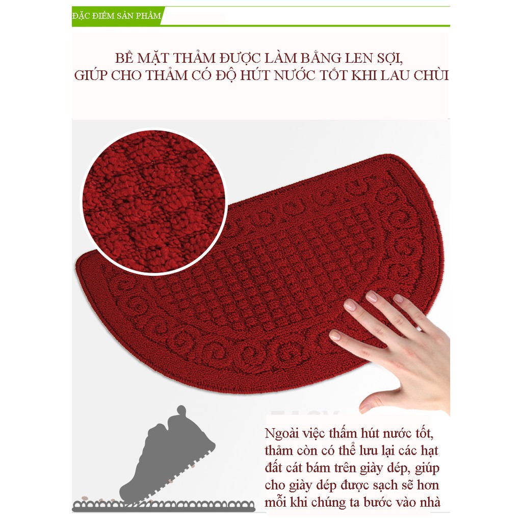 Chùi chân bán nguyệt kích thước 40*60cm với bề mặt mịn và đế cao su chống trơn, chống xước.Với nhiều màu sắc phù hợp mọi không gian. Thảm chùi chân bán nguyệt size: 40x60cm+ Thấm hút tốt, êm ái