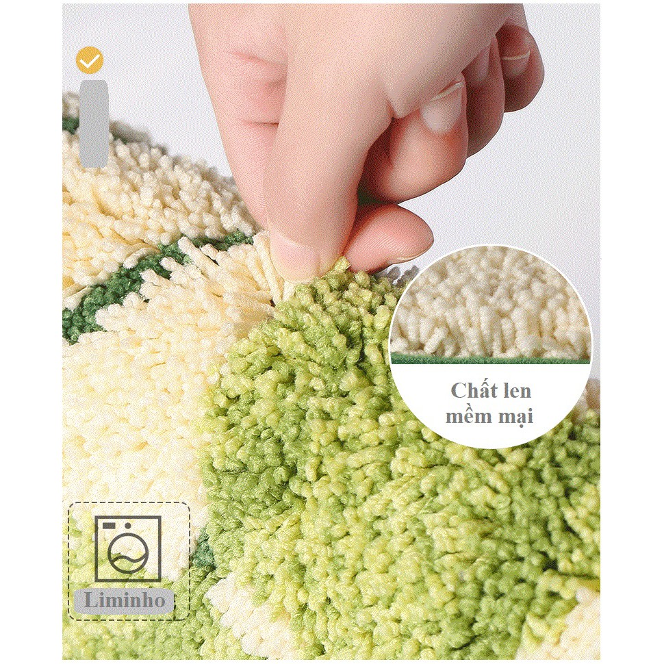 * Chất liệu: thảm chùi chân có mặt trên là lớp vải len dày, êm, mềm mịn có khả năng thấm hút nước khá tốt