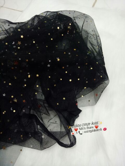 🍀 Vải voan kim tuyến ( đen) chụp ảnh, được đính nhữnh ngôi sao, trăng nhỏ nhỏ xynh xynh màu vàg đồng lấp lánh. Vải voan mềm mịn, sờ cực thích luôn, không phải loại voan cứng đâu ạ. 100cmx70cm (lẻ 50k)