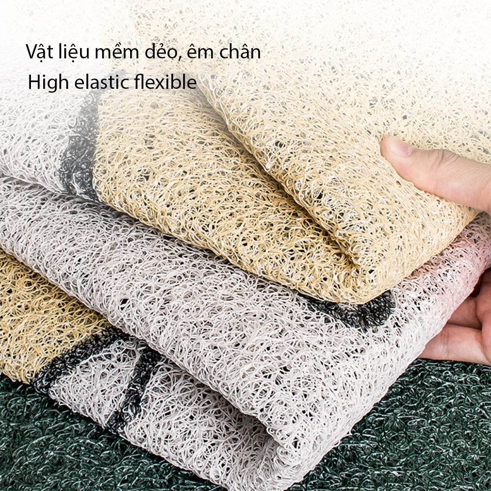 - Chất liệu nhựa pvc mềm dẻo, ít bám bẩn giúp thảm luôn như mới. Bạn chỉ cần chà nhẹ và xịt nước để giặt thảm sau thời gian sử dụng. Chất liệu nhựa cũng khô thoáng, giúp thảm mau khô sau khi vệ sinh.