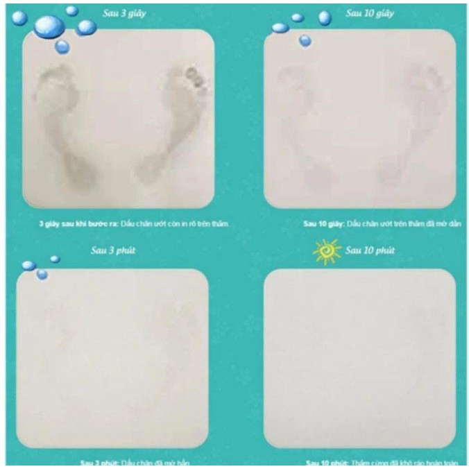 Chỉ cần đứng lên tấm thảm khi bước ra khỏi nhà tắm, toàn bộ nước ở mặt bàn chân được thảm thấm hút hoàn toàn, thấm khô đôi bàn chân chỉ sau 2 đến 3 lần di chuyển chân.