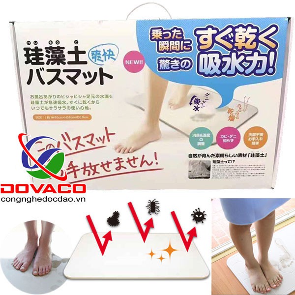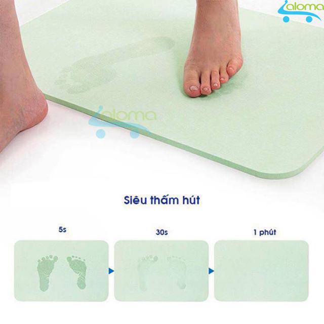 Chỉ cần dẫm chân lên thảm sau khi bước ra khỏi nhà tắm – nhà vệ sinh, toàn bộ nước dính ở lòng bàn chân sẽ được thấm hút hoàn toàn vào thảm, di chuyển chân khoảng 2-3 lần để lau khô hoàn toàn chân. Toàn bộ nước ở lòng bàn chân sẽ thấm vào thảm và thảm sẽ tự bốc hơi nước ra ngoài tự khô. Với khả năng thấm hút tới 70% khối lượng của thảm sau đó tự bốc hơi tự khô nhờ cấu tạo từ Diatomite, một loại vật liệu hóa thạch đặc biệt có vô số lỗ nhỏ kích thước 0.1 – 0.2 micromét. Chính vì thế thảm cứng siêu thấm Nhật Bản có thể thấm hút cực nhanh và tự bốc hơi rồi nước tự khô khiến thảm siêu thấm Nhật Bản luôn khô thoáng.