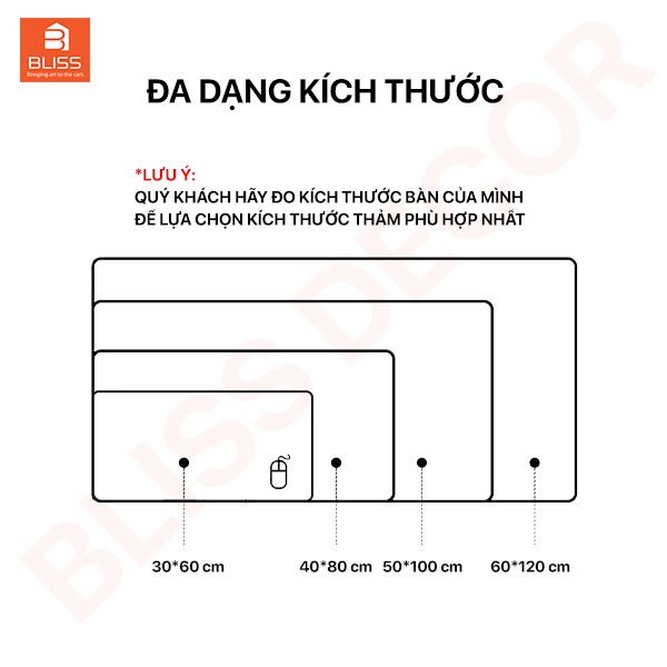 - Bạn hãy đo bàn làm việc của mình trước để có thể chọn được kích thước thảm lót phù hợp bạn nhé!