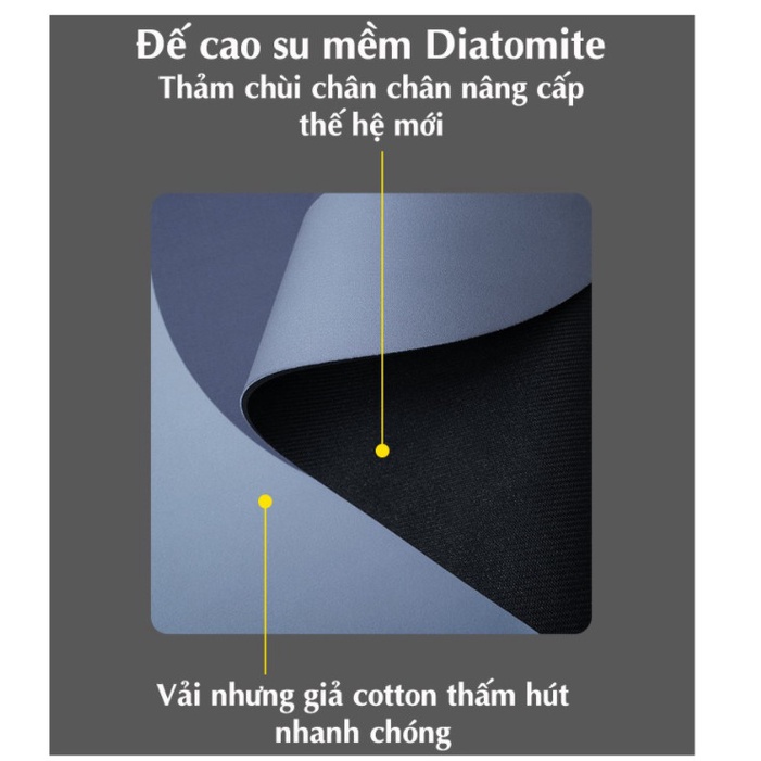 - Không trơn trượt, an toàn cho người già và trẻ nhỏ. Vật liệu Diatomite với những lỗ siêu nhỏ có khả năng tự thấm, hút ẩm siêu nhanh và ngay lập tức giải phóng lượng ẩm này vào không khí