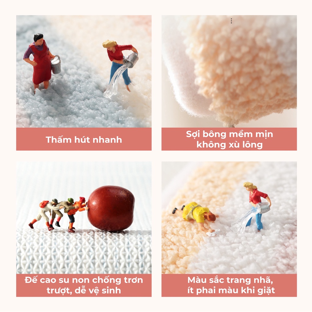 - Đa dạng công năng sử dụng: Thảm chùi chân, thảm lau, thảm nhà tắm, phòng ngủ, thảm phòng bếp.