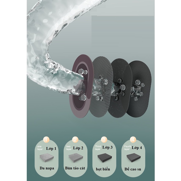 ❉ Cấu tạo 4 lớp đặc biệt gồm lớp 1 (da mặt trên), lớp 2 (bùn tảo cát), lớp 3 (bọt biển siêu thấm hút), lớp 4 (đế cao su)