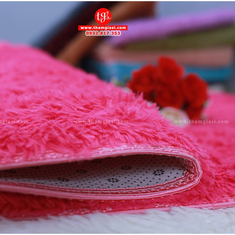 Độ dày thảm 4,5cm, mặt trên là lớp lông xù sợi dài dày và mướt mịn