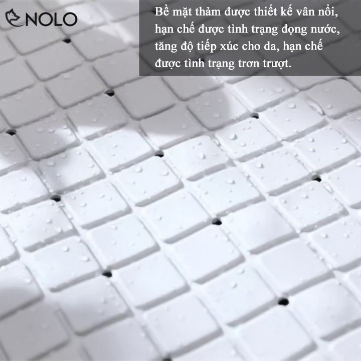 Bề mặt thảm được thiết kế vân nổi, hạn chế được tình trạng đọng nước, tăng độ tiếp xúc cho da, hạn chế được tình trạng trơn trượt.