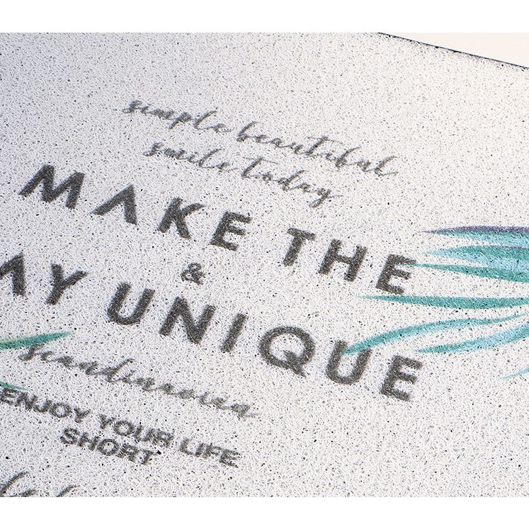 Thảm có kích thước 40x60cm và 60x90cm màu xanh lá cây kết hợp họa tiết chữ tinh tế, bắt mắt.
