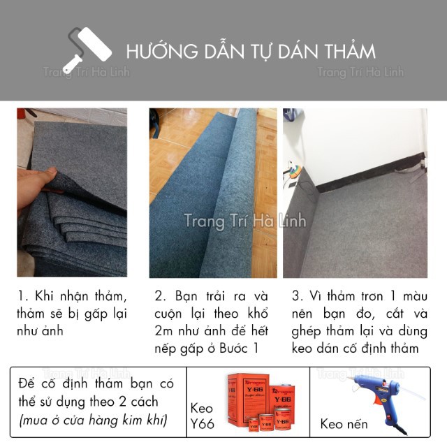 Để cố định thảm bạn dùng thêm keo Dragon Y66 hoặc băng dính xốp xanh 2 mặt (như trong album ảnh).