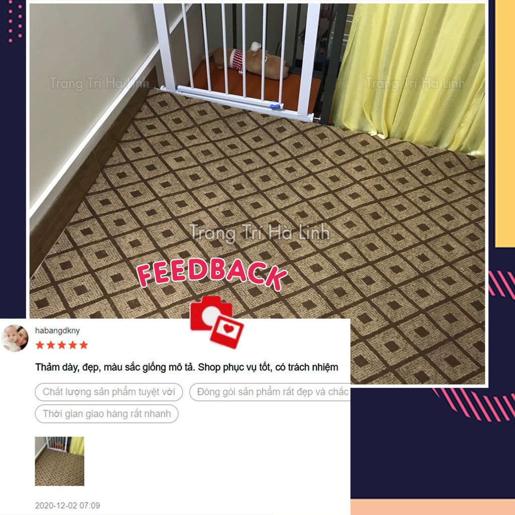 Vì khổ cuộn thảm là 2m ngang và kéo dài tới 50m dài nên shop cắt theo khổ thảm 2m ngang cố định và dài tùy ý
