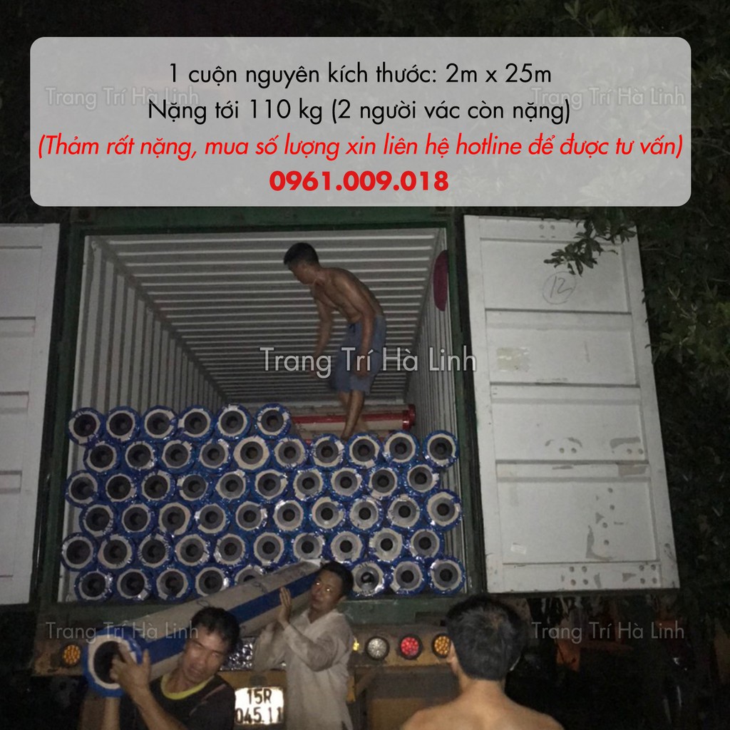 Thảm siêu nặng (1 cuộn nguyên 2mx25m nặng tới 110kg, 2 người vác còn mệt), tức 1m vuông thảm nặng hơn 2kg.
