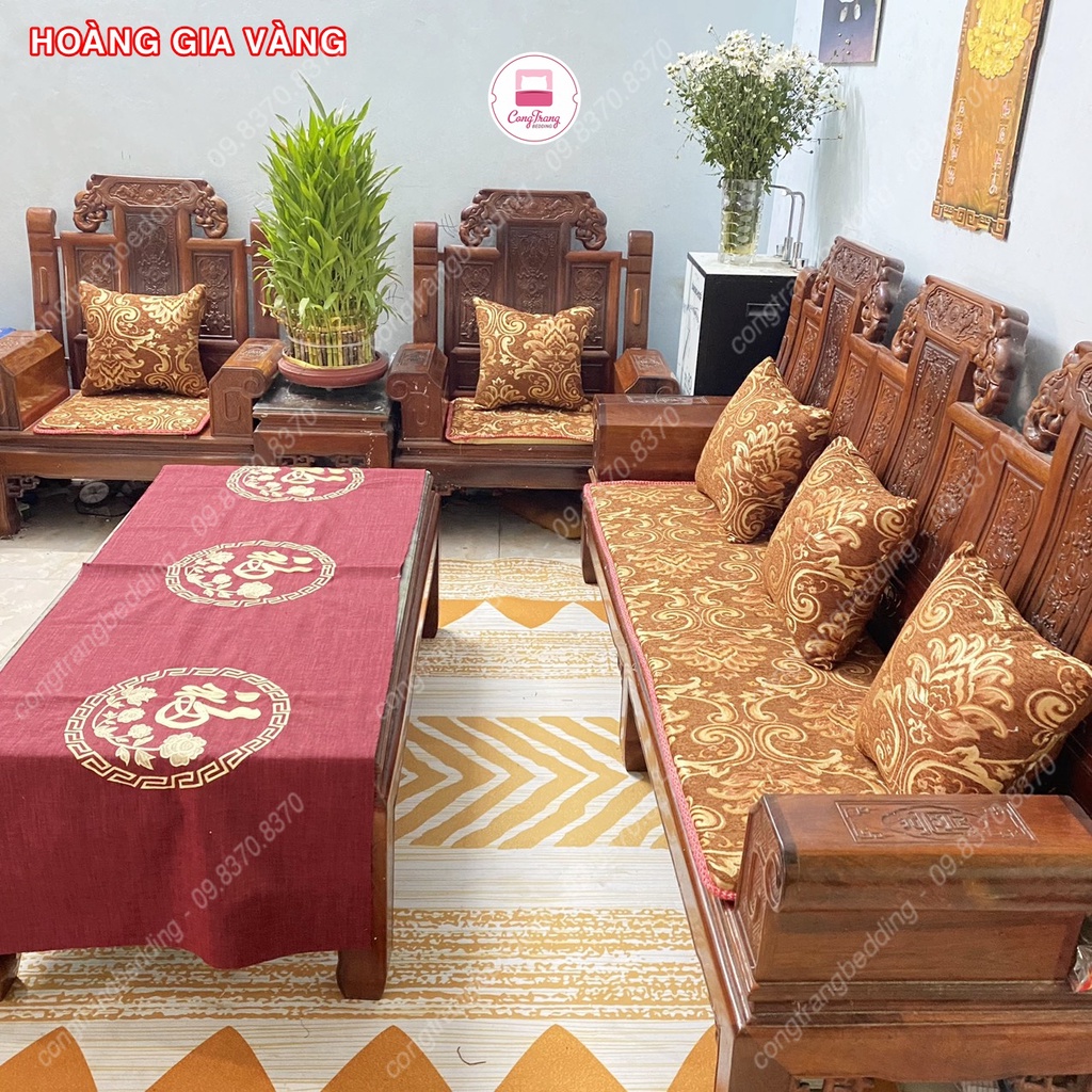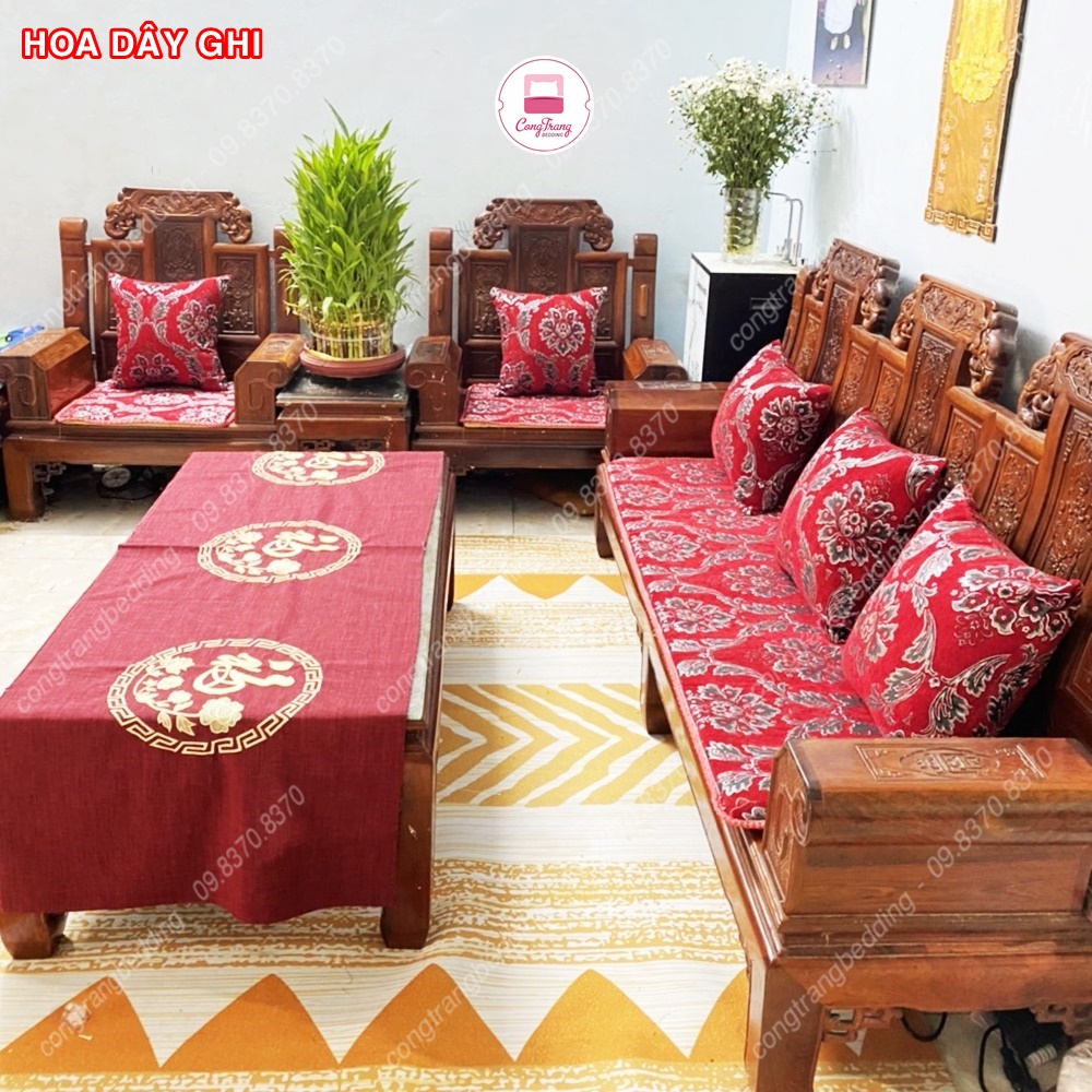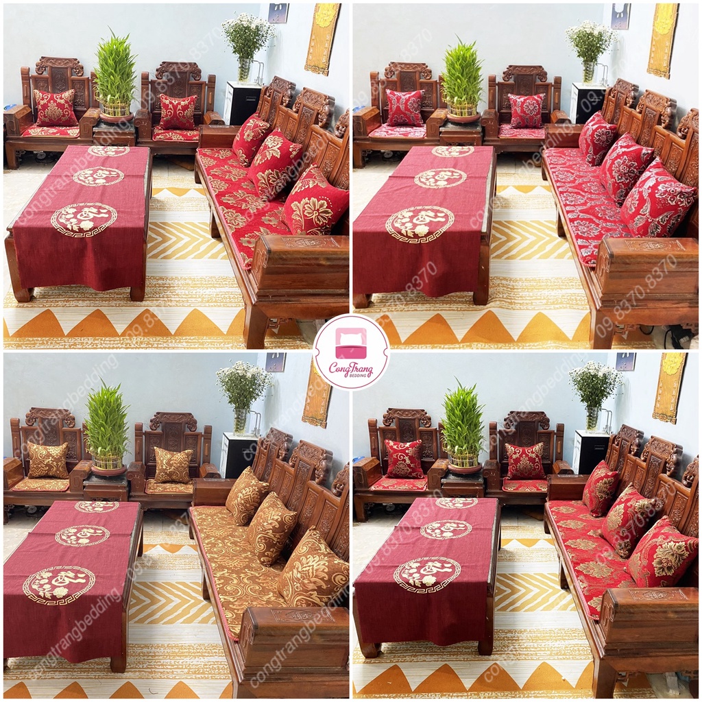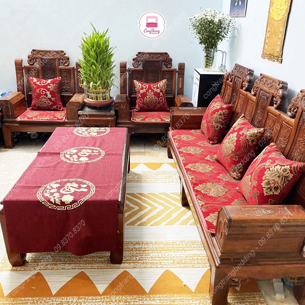Thảm trải ghế phòng khách, trọn bộ đệm ghế sofa, thảm trải ghế gỗ, gối tựa thêu vi tính vải gấm cao cấp