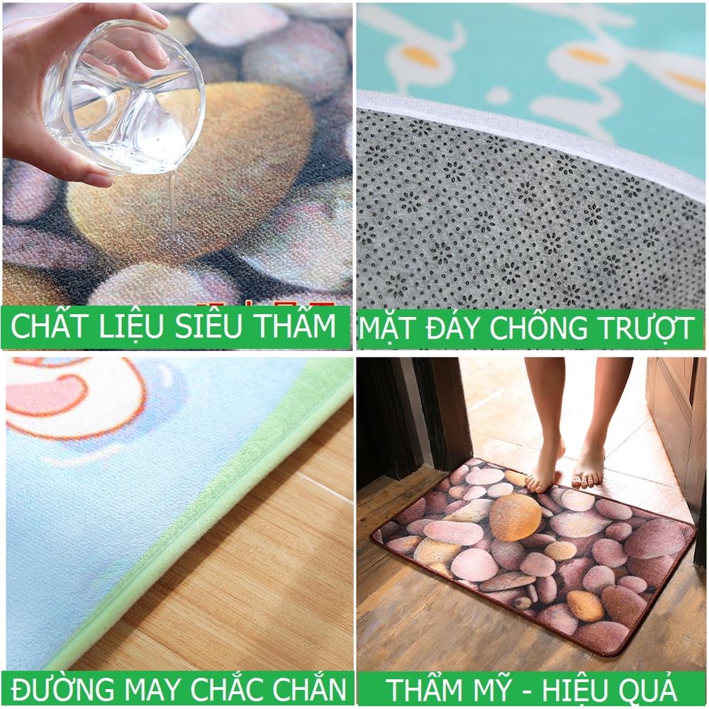 Thảm trải sàn 3D trang trí chống trượt : Có lớp chống trơn trượt an toàn, hiệu quả khi sử dụng lau chùi chân khu vực khô.Thảm trải sàn chùi chân được chia thành nhiều loại với các mục đích sử dụng khác nhau: Thảm chùi chân chống bụi bẩn khô, Thảm chùi chân chống thấm nước, Thảm chống trượt (Nhà tắm), Thảm chống chất bẩn khó tẩy ra sàn nhà (Bếp), Thảm ngồi (Ghế, Sàn nhà, Giường…), Thảm trang trí phòng, chụp ảnh…