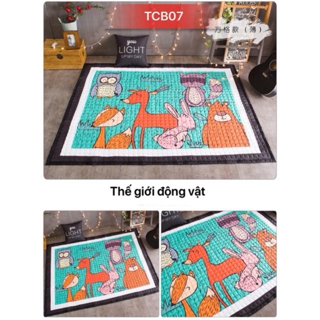 Thảm vải với nhiều hình thù ngộ nghĩnh đáng yêu cho bé trai và gái. Chất liệu vải cotton mềm mại, lót bông dày 1,5cm giúp trẻ dễ dàng lăn lê bò toài.