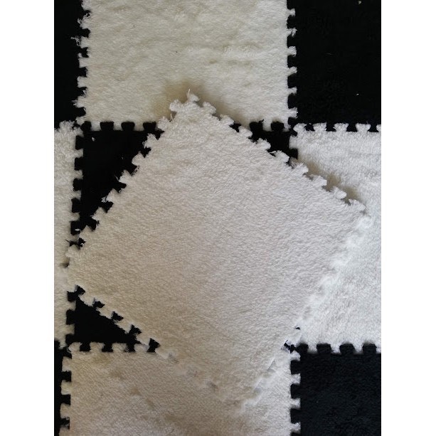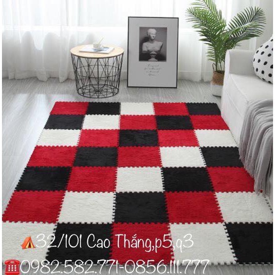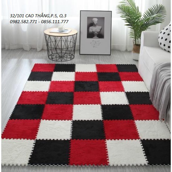 THẢM XỐP LẮP GHÉP MẶT LÔNG NHUNGKích thước: 150cm x 210cm , combo 35 tấm lắp ghép gồm 10 miếng màu trắng, 12 miếng màu đen,13 miếng màu đỏ