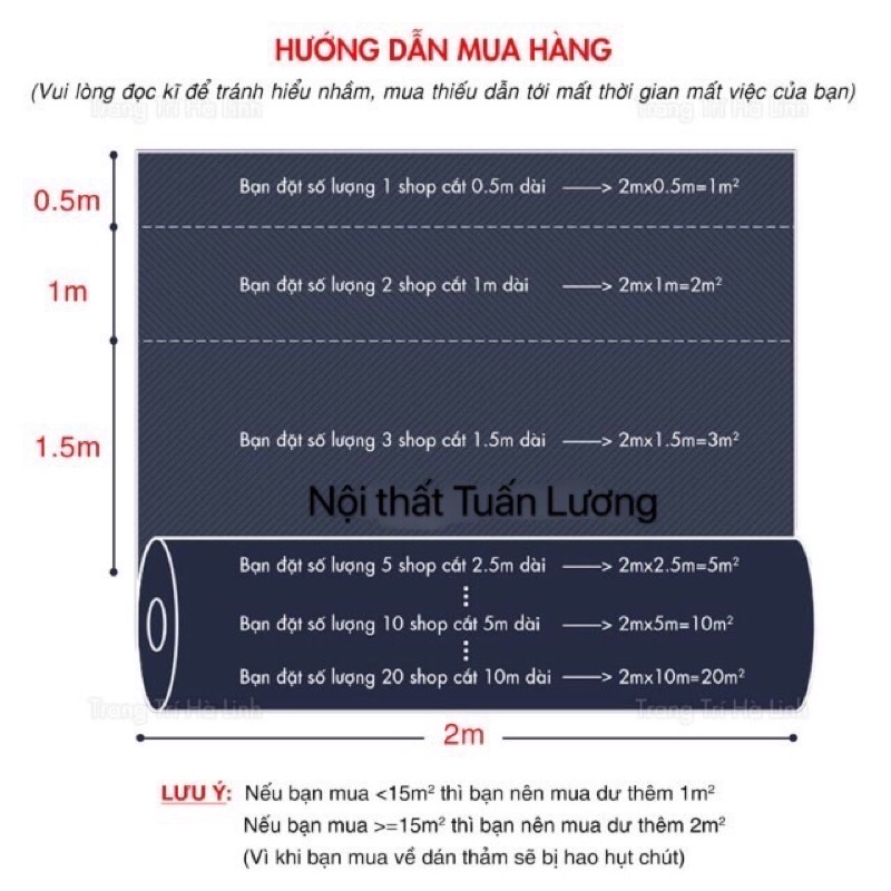 Lưu ý: Bạn nên mua dư ra khoảng 1 đến 2m vuông (bị hao hụt do cắt ghép thảm khi thi công)