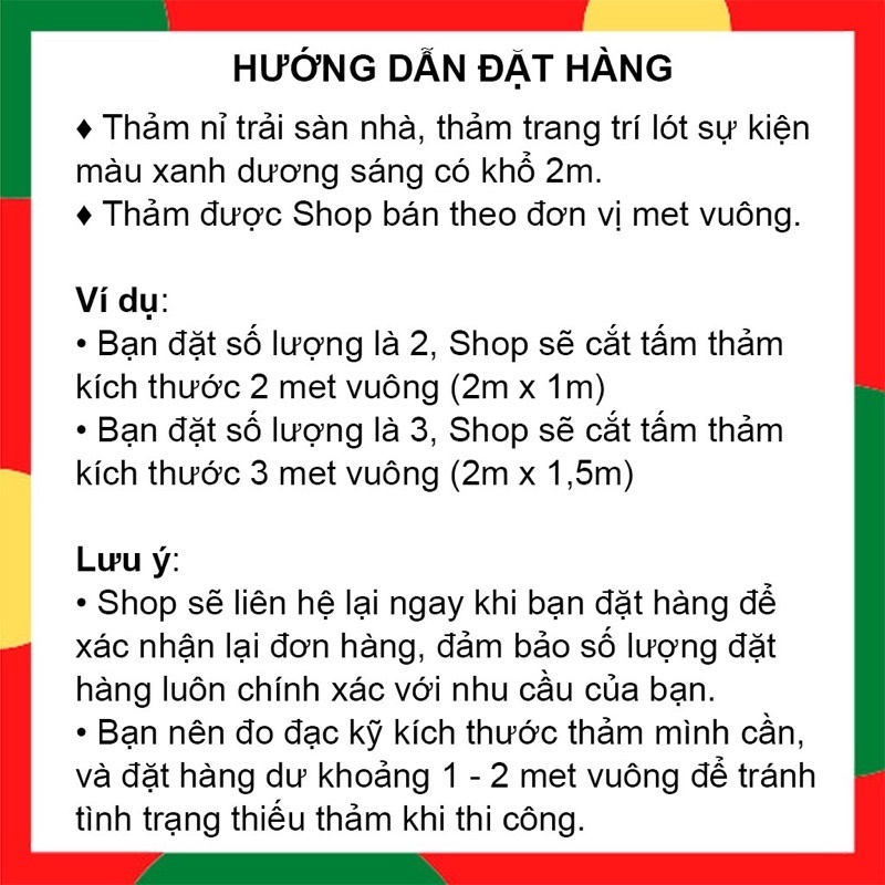 Ví dụ: Khách hàng chọn số lượng đặt hàng là 10 (là 10 met vuông), Shop sẽ cắt thảm với kích thước 2m x 5m.