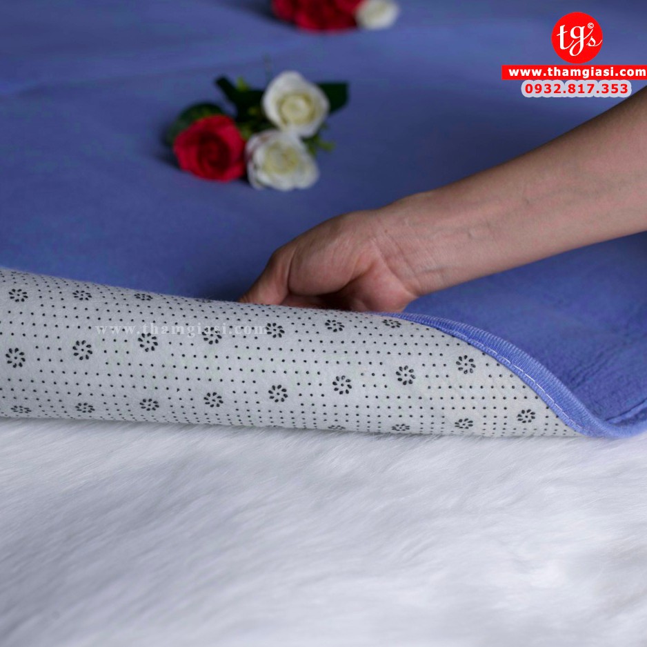 Có cấu tạo bề mặt thảm là một lớp vải nhung lụa mềm mịn và vô cùng mướt mắt. Lớp nệm lót ở giữa tạo sự dày dặn và êm ái cho thảm. Mặt dưới cùng là lớp chống trượt với các hạt nhựa nổi giúp cố định thảm. Loại thảm này cực kì phù hợp cho không gian phòng khách, phòng đọc sách, phòng ngủ hay phòng chơi của bé bởi tính năng mềm mịn và tuyệt đối không rụng lông của lớp vải nhung lụa.