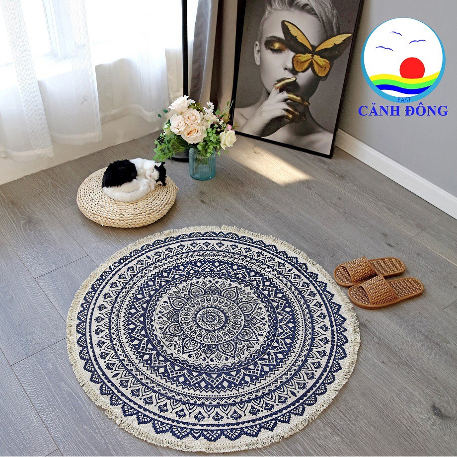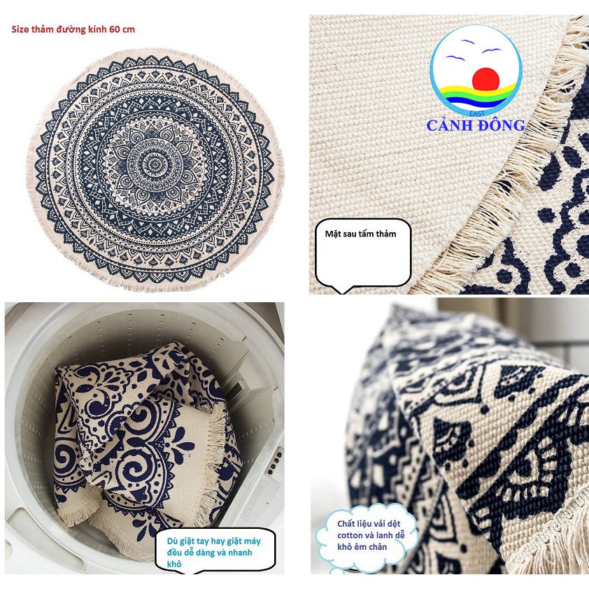 • Thảm trải sàn trong hoa mandala được làm từ chất liệu vải cotton và lanh cao cấp với đường kính 60cm, chất vải dày dặn, dù giặt tay hay máy đều rất dễ dàng và nhanh khô.