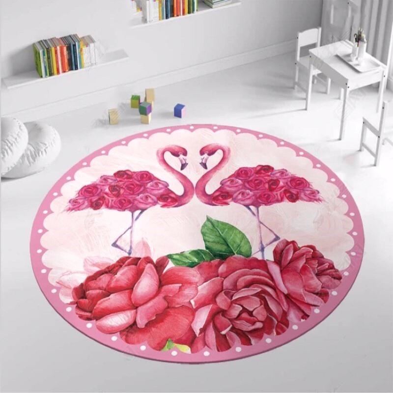 Thảm tròn đường kính 1mét. Chất liệu mặt trên thảm là nỉ, bề mặt nhẵn, mịn, vải lì rất dễ vệ sinh.
