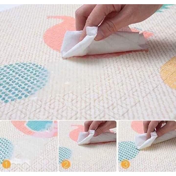 �� Thảm được phủ 2 lớp bề mặt là silicon XPE, nên CHỐNG THẤM TUYỆT ĐỐI. Bé tè lau nhẹ là sạch. Bé ăn dặm vương vãi mẹ lướt nhẹ khăn là cũng okie.