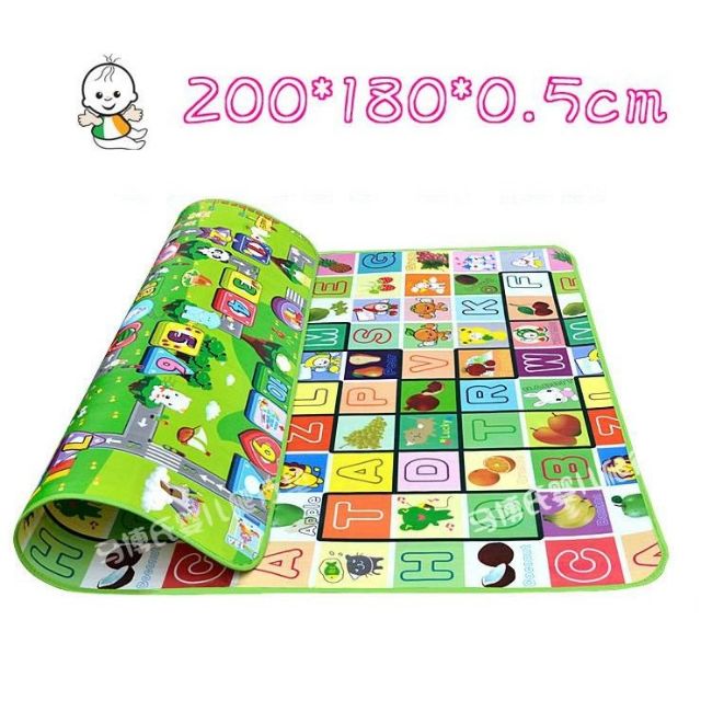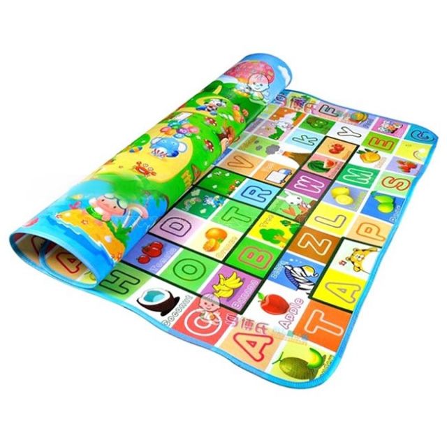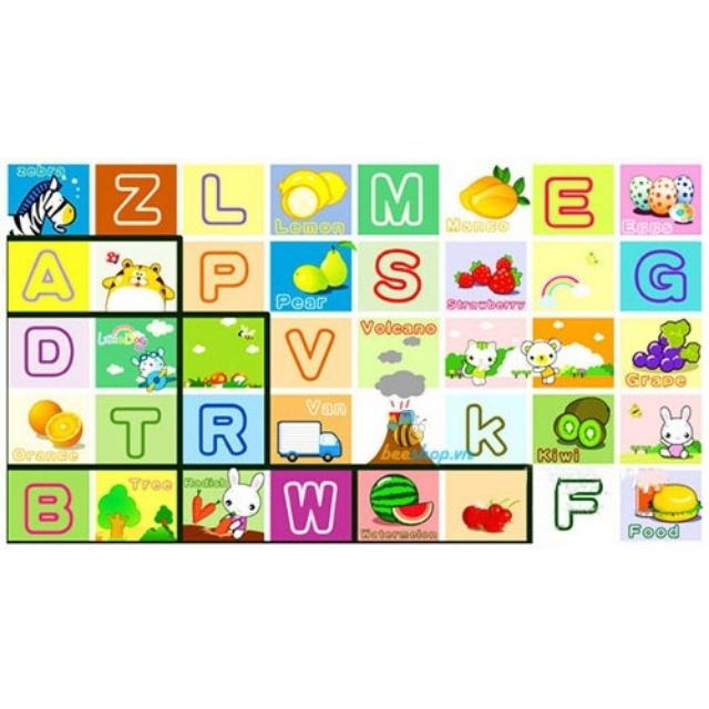 2 mặt thảm được trang trí khác nhau với những hình ảnh, màu sắc vô cùng sống động giúp bé làm quen với các con số, chữ cái, các nhân vật hoạt hình hay các loại hoa quả. Đối với các bé lớn hơn có thể học những từ tiếng anh thông dụng ngay trên tấm thảm này.