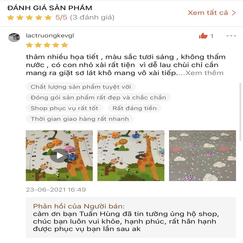 - Thảm chống trượt, không thấm nước , cách nhiệt, mềm mại, dễ lau chùi, màu sắc tươi sáng, bắt mắt,không bị quăn góc.