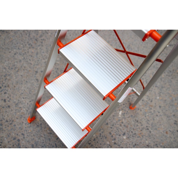 - Bậc thang được thiết kế bản to chắc chắn. Bậc thang được làm bằng nhôm dầy chịu được lực nặng, chống móp méo, hay cong vênh.