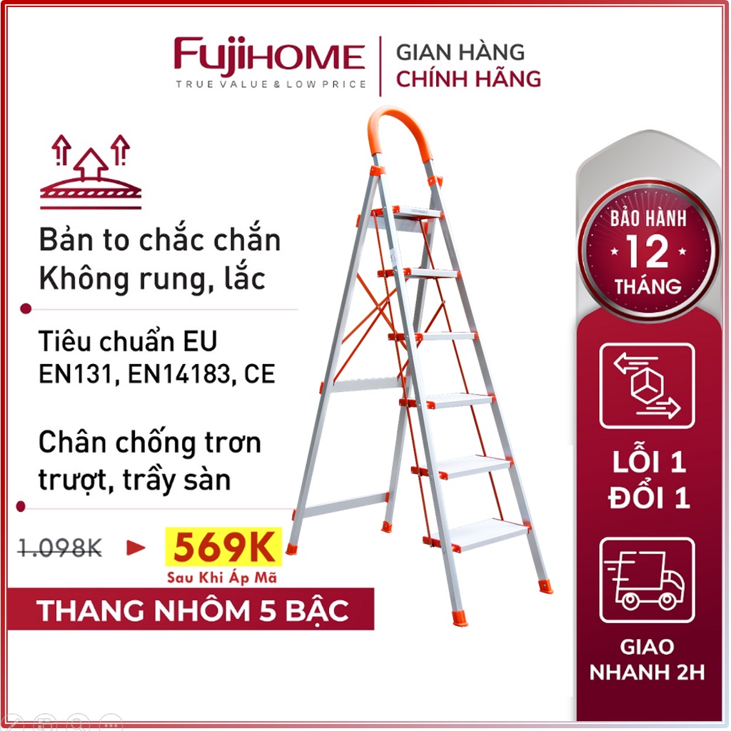 Thang ghế nhôm tay vịn chữ A bản to 4 - 5 - 6 bậc từ 1,4M - 1,9M xếp gọn FUJIHOME, Thang chữ A gia đình đa năng rút gọn