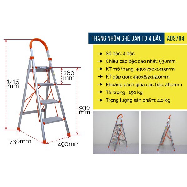 Giới thiệu Thang ghế nhôm chữ A bản to 4 bậc tay vịn 1,4M xếp gọn nhập khẩu ADVINDEQ ADS-704, thang ghế gia đình đa năng