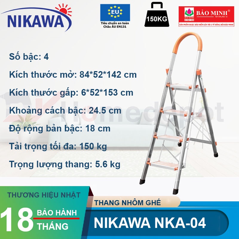 1. Thông số kỹ thuật của Thang nhôm, thang ghế, thang chữ a Nikawa NKA-04 - 4 bậc- nhập khẩu Nhật Bản, bảo hành 18 tháng